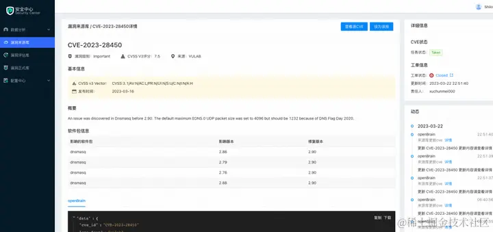 该平台为社区开发专为安全漏洞流转等流程实现的平台,该平台可以实现安全感知、安全评估、安全分发、安全管理等一系列针对安全漏洞的管理能力。该平台在安全修复中起到了举足轻重的作用,实现了社区研发人员的高效沟通。