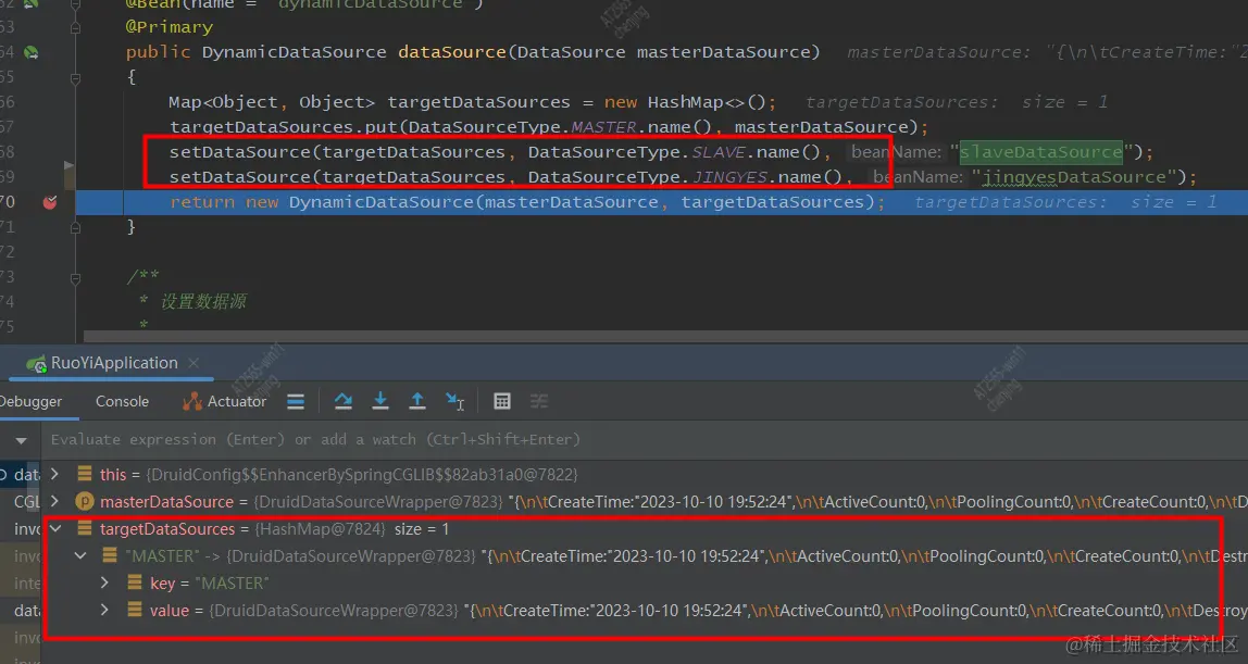 跟踪调试一下,发现个问题,这里的targetDataSources居然只有Master,那put进去的其他两条呢?