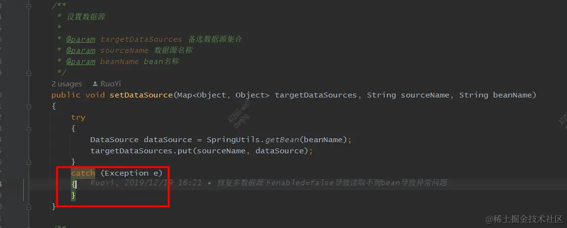 终于被我找到了个若依的坑:这里的异常被吃掉了!!