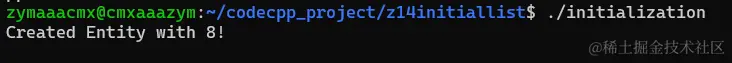 创建 Entity 类的实例对象 e0 时,首先会调用 Example 类的默认构造函数,输出 "Created Entity!",并创建一个临时的 Example 类对象。然后,在 Entity 类的构造函数体中,通过赋值运算符将这个临时对象的值赋给 m_Example 成员变量。