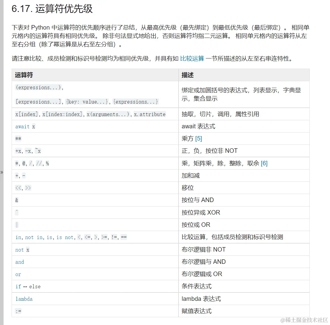 那么,这么多运算符在参与运算时,谁先参与计算?谁后计算?比如数学运算中先算乘除,后算加减一样,Python中也有规则,称之为运算符优先级。下表总结了Python中的运算符优先级,从最低优先级(最少绑定)到最高优先级(最多绑定)。同一框中的运算符具有相同的优先级。除非明确给出语法,否则运算符是二进制的。运算符在同一框中从左到右分组(除从右到左分组的求幂运算外)。 请注意,比较、成员测试和身份测试都具有相同的优先级,并且具有比较部分中描述的从左到右的链接特性。