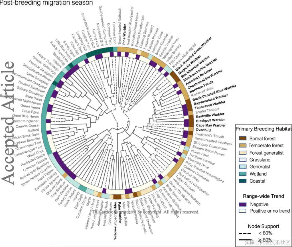 在迁徙期,大多数林莺之间展现出了较强的正相关,与森林中的其他物种也有强关联性。 这与观察的结果一致,林莺会与红眼绿鹃、黑冕山雀等其他物种组成混合迁徙队伍。