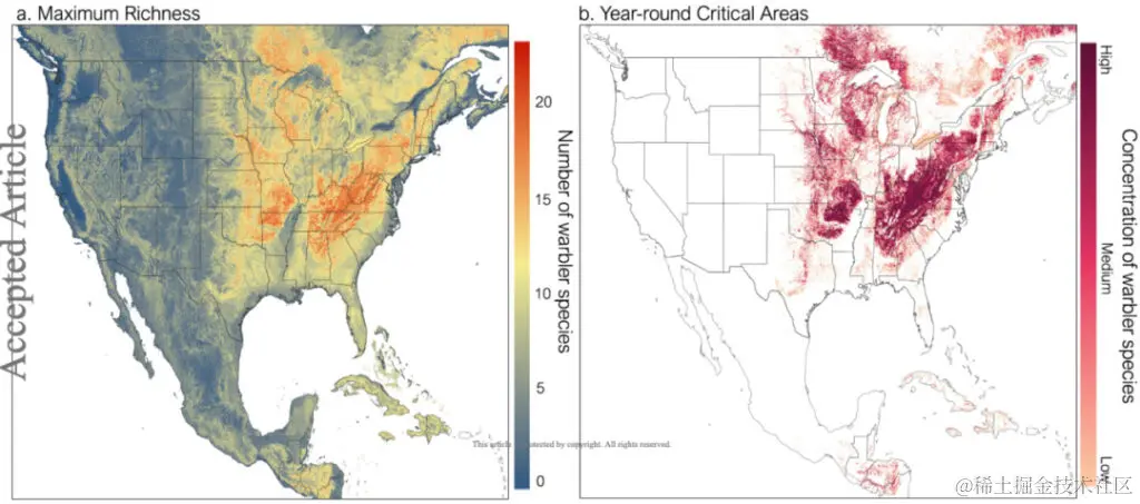 在对 eBird 的数据进行分析后,DMVP-DRNets 模型输出了空间分辨率为 2.9 km2 的北美林莺各月分布图。不同品种林莺在北美的分布动态性很强,每个月都有不同的分布热点。在对各月分布图进行叠加后,研究人员发现阿巴拉契亚山脉是林莺物种多样性最高的区域。