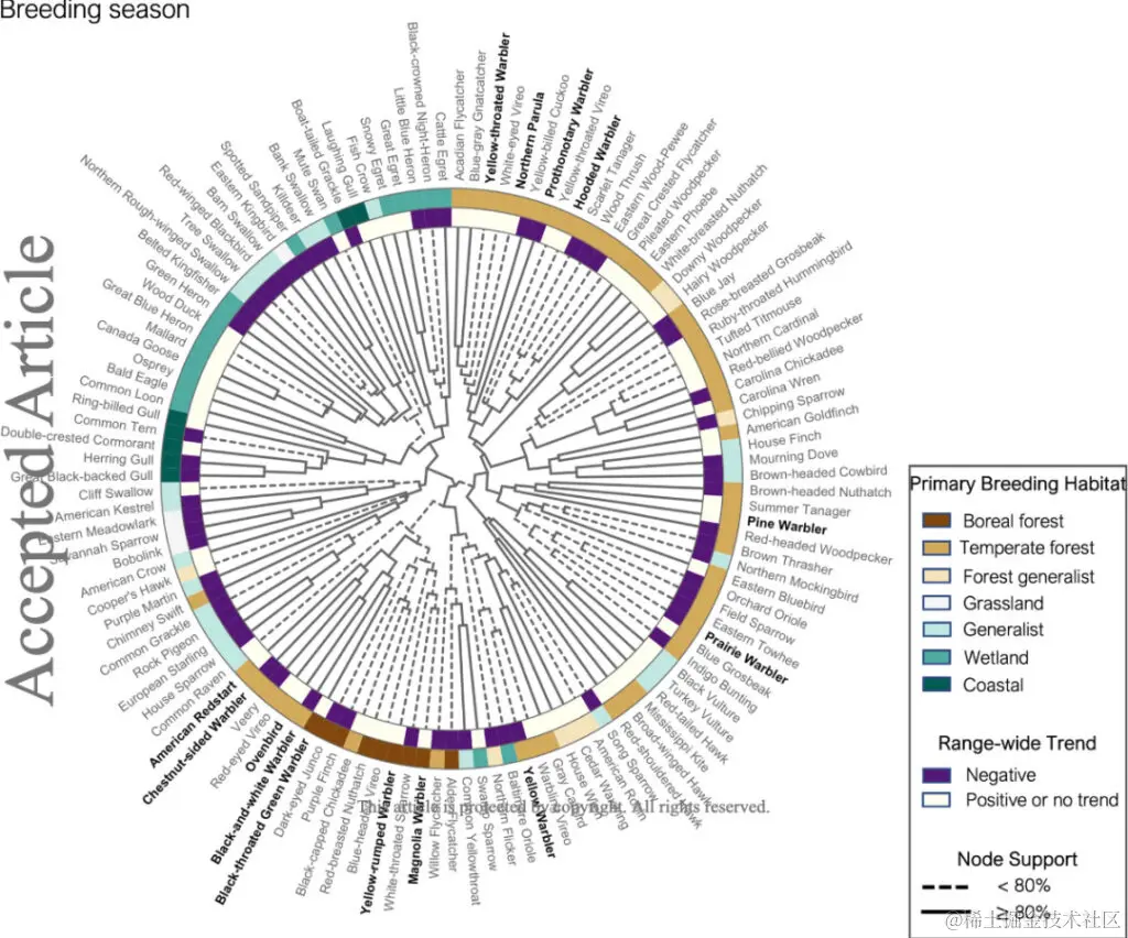 近期,康奈尔大学的研究者们利用深度学习,分析了 900 万组鸟类数据,得到了林莺在北美洲的分布数据,开启了生态数据分析的新篇章。