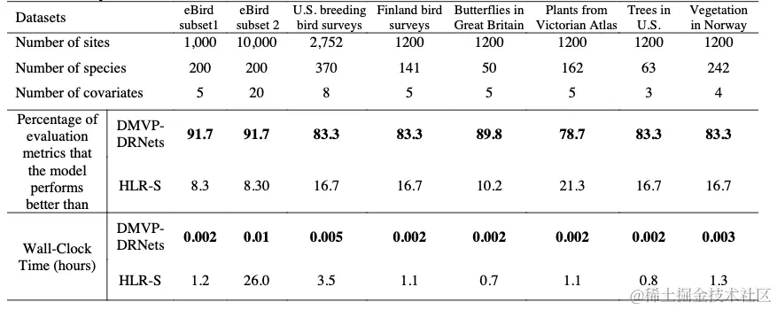 首先用 10,000 组 eBird 数据对两个模型进行训练。HLR-S 模型训练用时超过 24 小时,而 DMVP-DRNets 模型耗时不足 1 分钟。