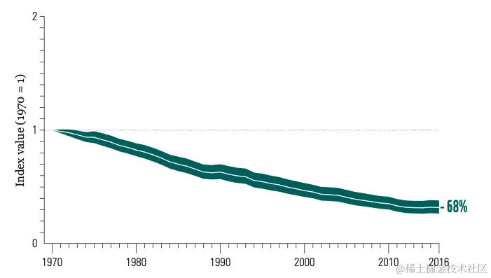 图 1: 1970-2016 年,全球 4,392 个代表物种、 20,811 个种群的平均数量变化
