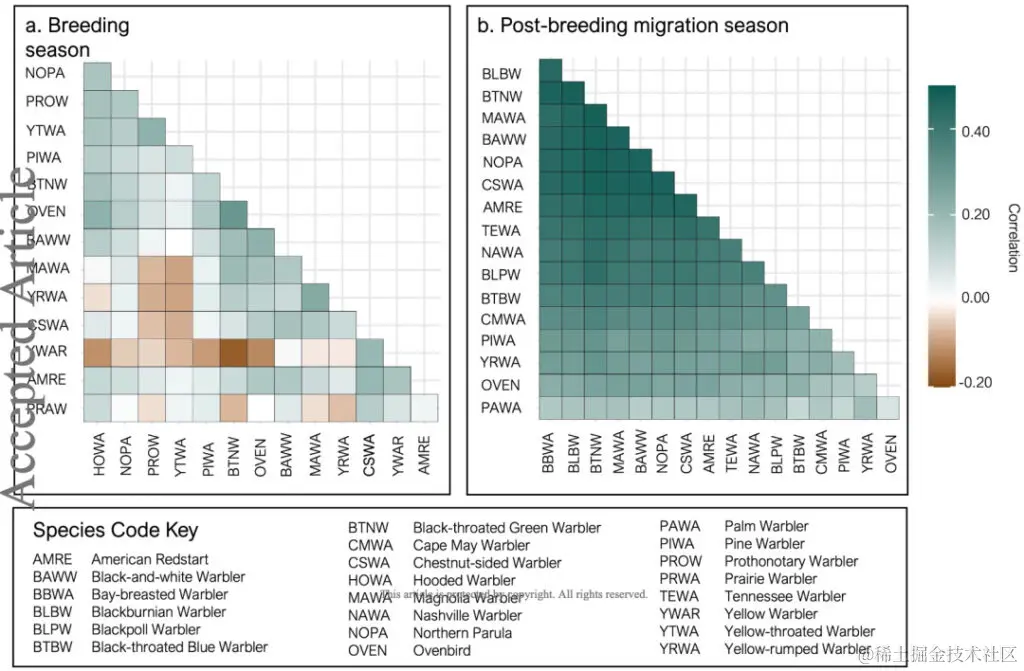 图 8:繁殖期 (a) 和繁殖后迁徙期 (b) 林莺与其他物种的相关系数