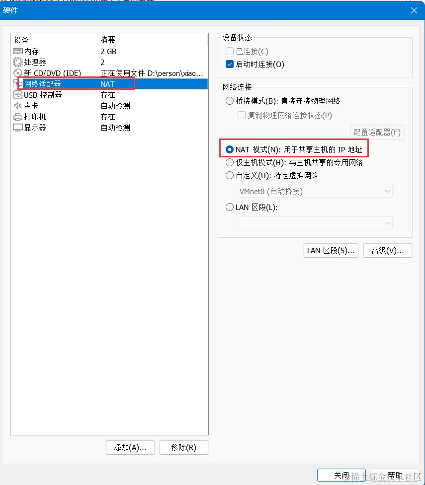 NAT 模式:这种模式下,虚拟机通过宿主机的 IP 地址进行网络通信。VMware 会为虚拟机 Nic 分配一个虚拟IP,并为其设置一个 NAT 私有子网,从而把虚拟机和物理网络分开。(一般选择这种)