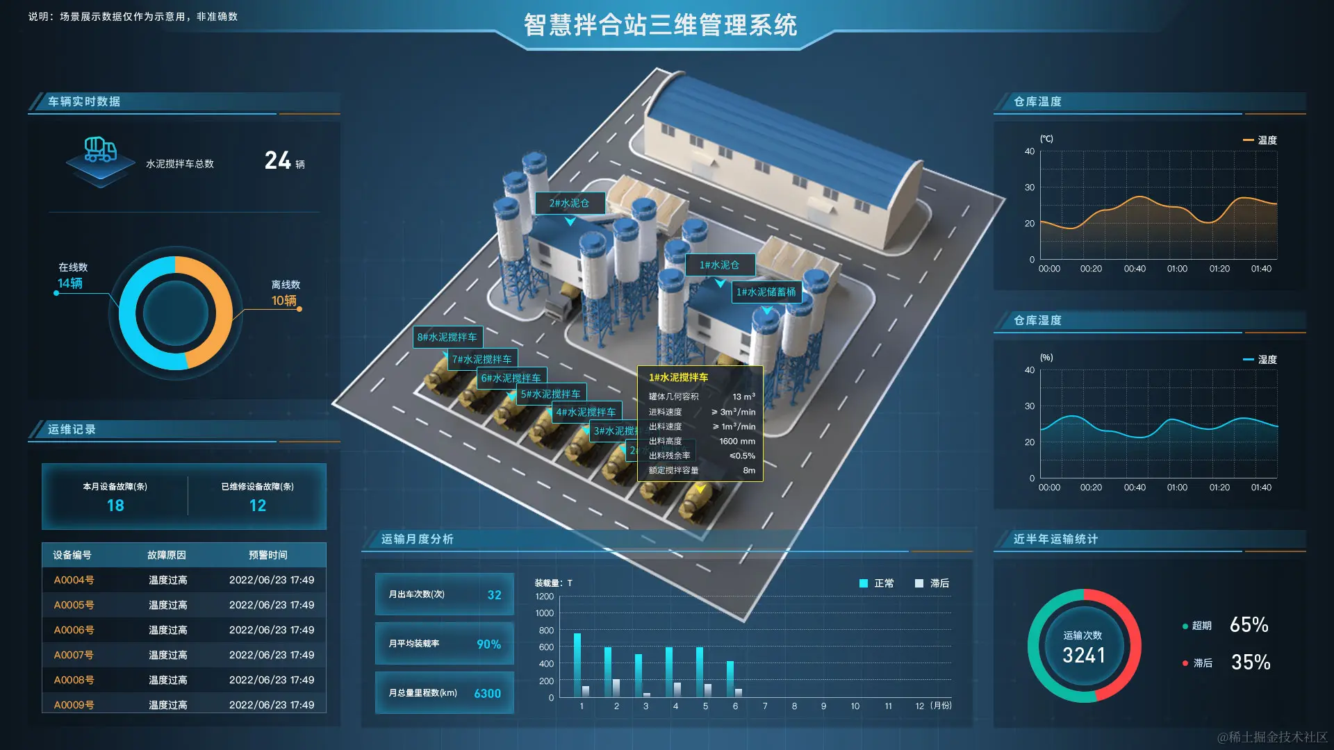 数字孪生智慧搅拌站三维可视化管理平台基于人工智能、物联网、5G、大数据等先进技术,采用 数维图(以下简称 SovitJS )创新的 2D/3D 可视化组态和三维建模技术,数字孪生搅拌站三维可视化系统,对基地内的人、设备、环境进行全面感知,打通物料验收、料仓引导、存量管理、混凝土生产、混凝土调度等各关键环节数据孤岛,为混凝土搅拌站智慧化管理赋能,有效解决了传统混凝土搅拌站生产管理、物料验收发料管理难度大,数据孤岛严重等痛难点问题。