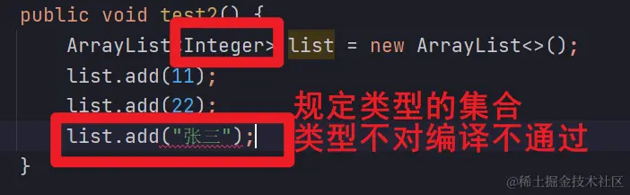 - 从 JDK1.5 以后,Java 引入了“参数化类型”的概念,允许我们在创建集合时再指定集合元素的类型,比如:List< String >,这表明该List 只能保存字符串类型的对象。