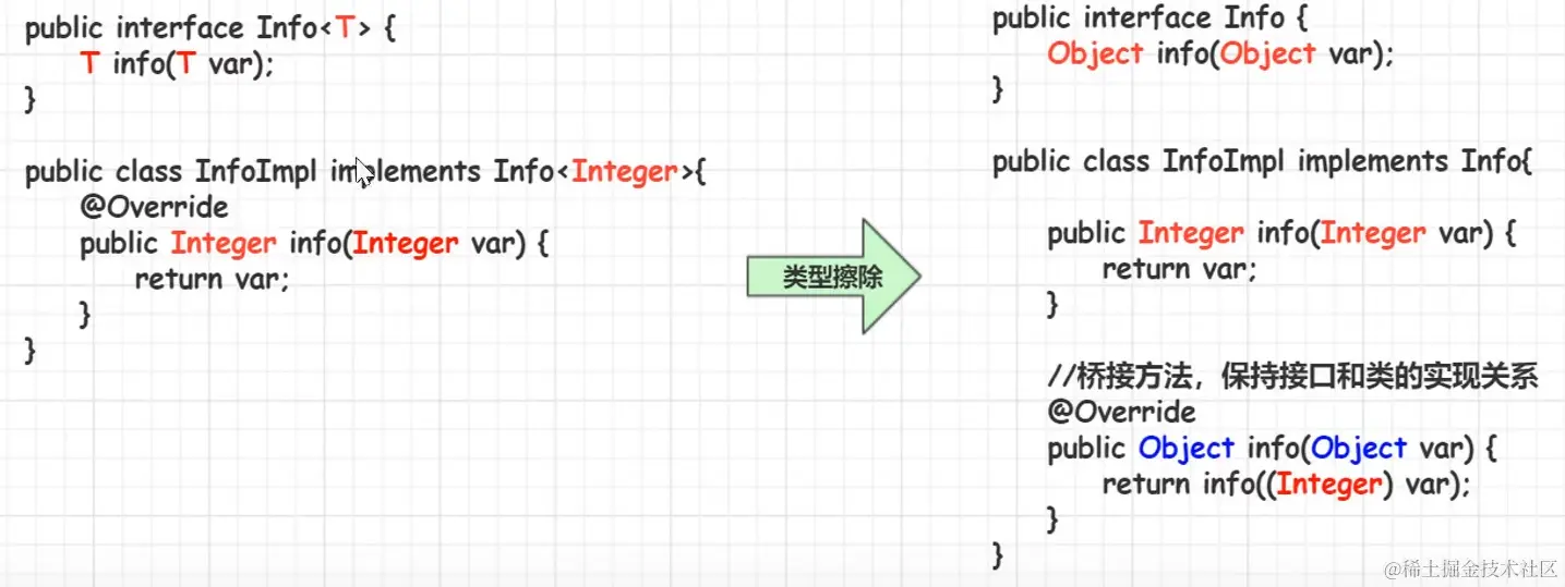 桥接方法就是为了保证接口实现的规范和约束,得到对接口的重写,所以会生成两个方法 一个是为了保证类型擦除的 Object,另一个是接口实现的 Integer
