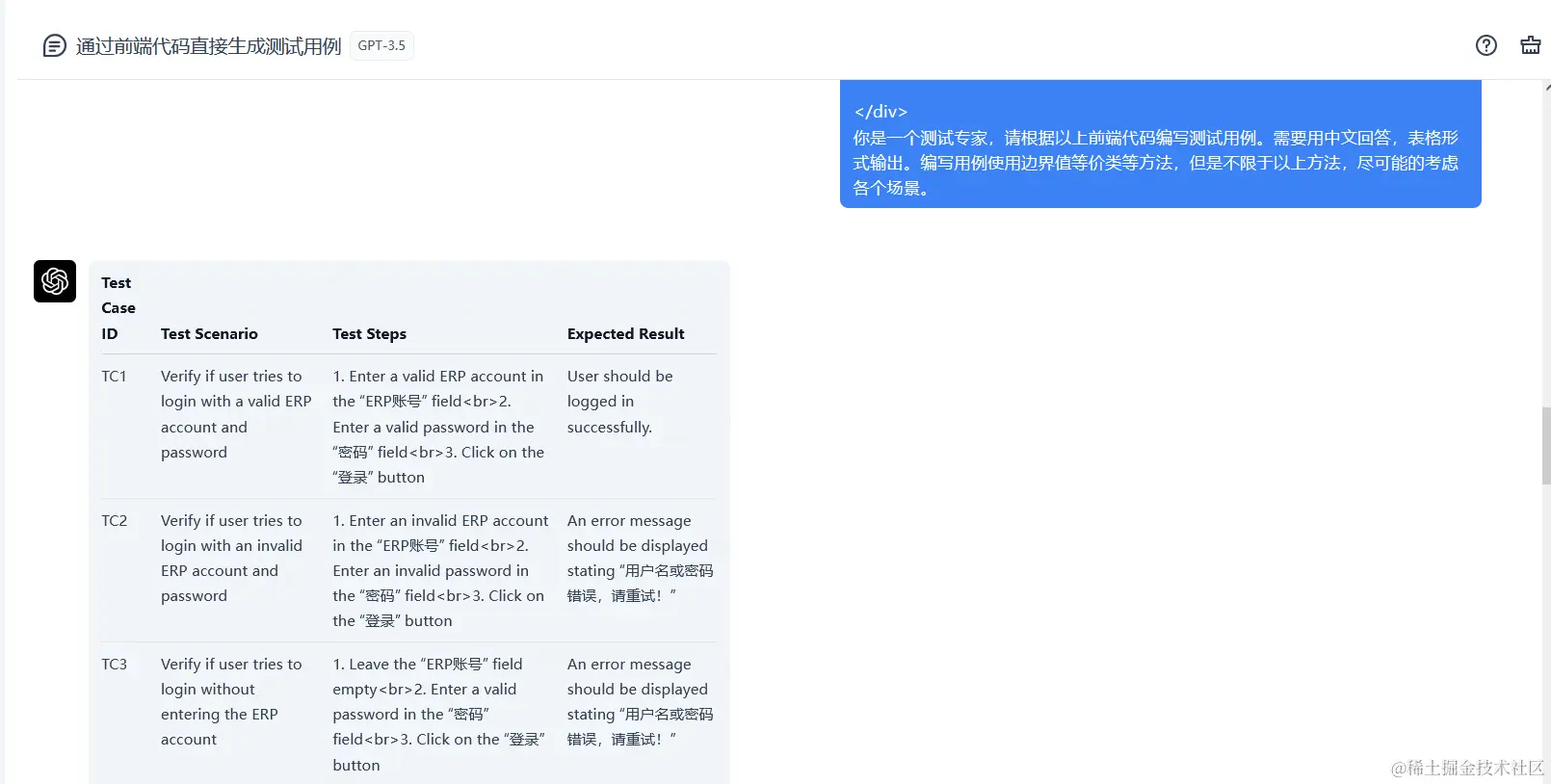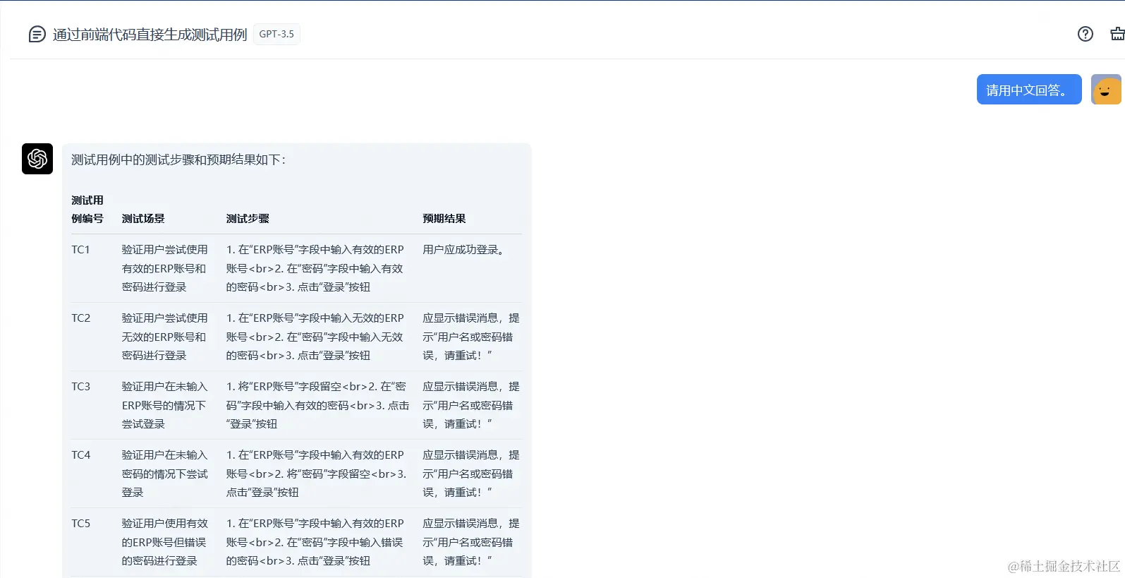 测试工程师在整个测试流程中,需求分析及编写测试用例在整个流程中占很大一部分比例。如果能通过chatGPT进行需求分析后,输出质量比较好的测试用例,将大大提升测试工程师的工作效率。然而经过测试有时候将需求输入给chatGPT后并不能生成令人满意的结果。但是对于系统或表单级别的需求,chatGPT给出的结果基本可以让人满意。甚至可以通过给定前端功能代码直接生成测试测试用例。