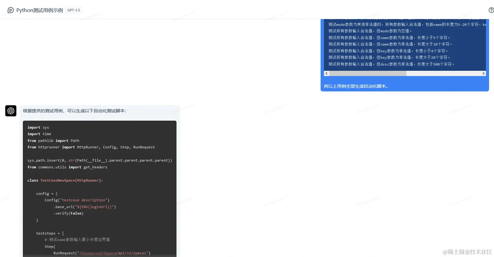 实现过程思路:先将写好的接口自动化脚本例子提供给chatGPT,然后将生成的接口测试用例提供给chatGPT.其就可以按照给定的样例,将接口自动化测试用例自动转换为脚本。当然具体的断言还需要根据实际情况进行修改。说明:结果截图太长只展示了一部分。