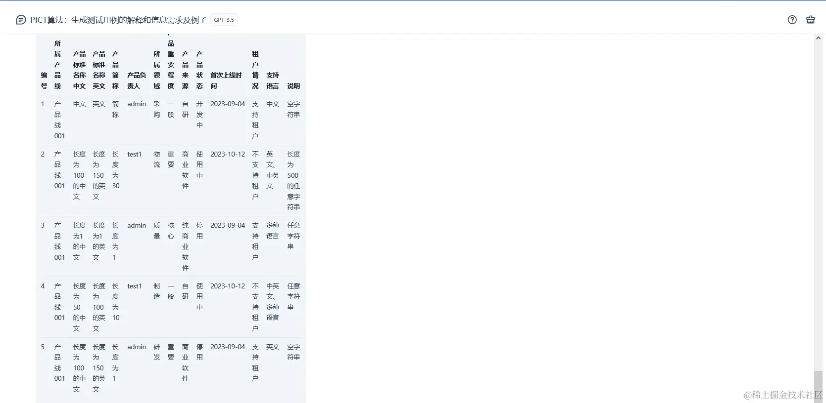 例:给出指定表单各个字段输入参数,参数取值范围及约束条件,需要chatGPT生成各种用例组合。说明:结果截图太长只展示了一部分。