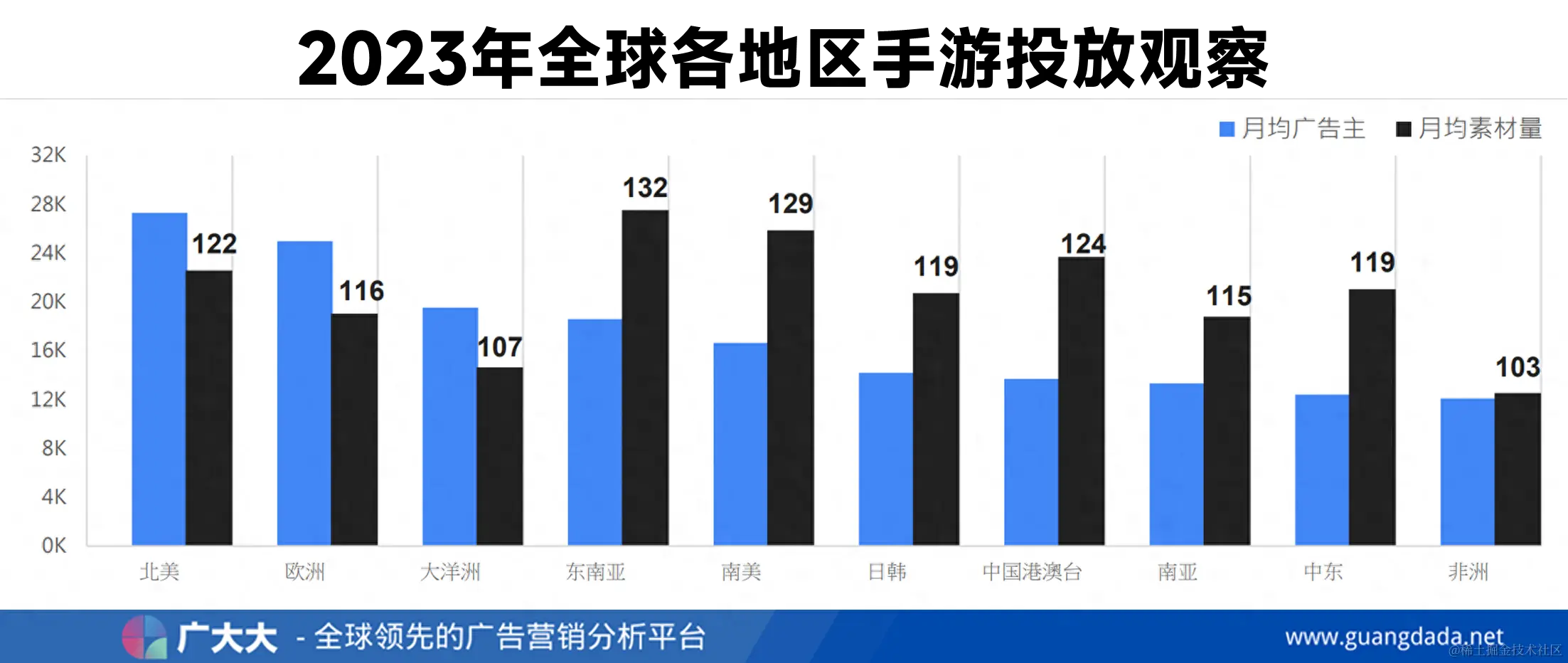 东南亚地区月均素材量132条为最高,其次是南美、中国港澳台和北美,这4个地区月均手游素材量超过120条。
