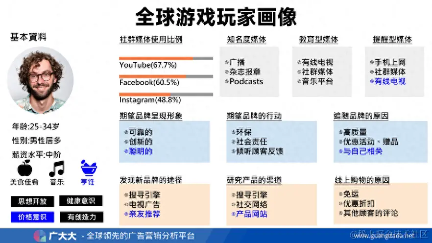 通过问卷调查和数据统计的形式,我们得以收集并总结出全球游戏玩家的画像。总体来看玩家大部分集中在25-34岁之间,且以男性玩家居多。喜欢使用YouTube、Facebook和Instagram等社交平台,其中超67%的游戏玩家都会在YouTube上观看视频。