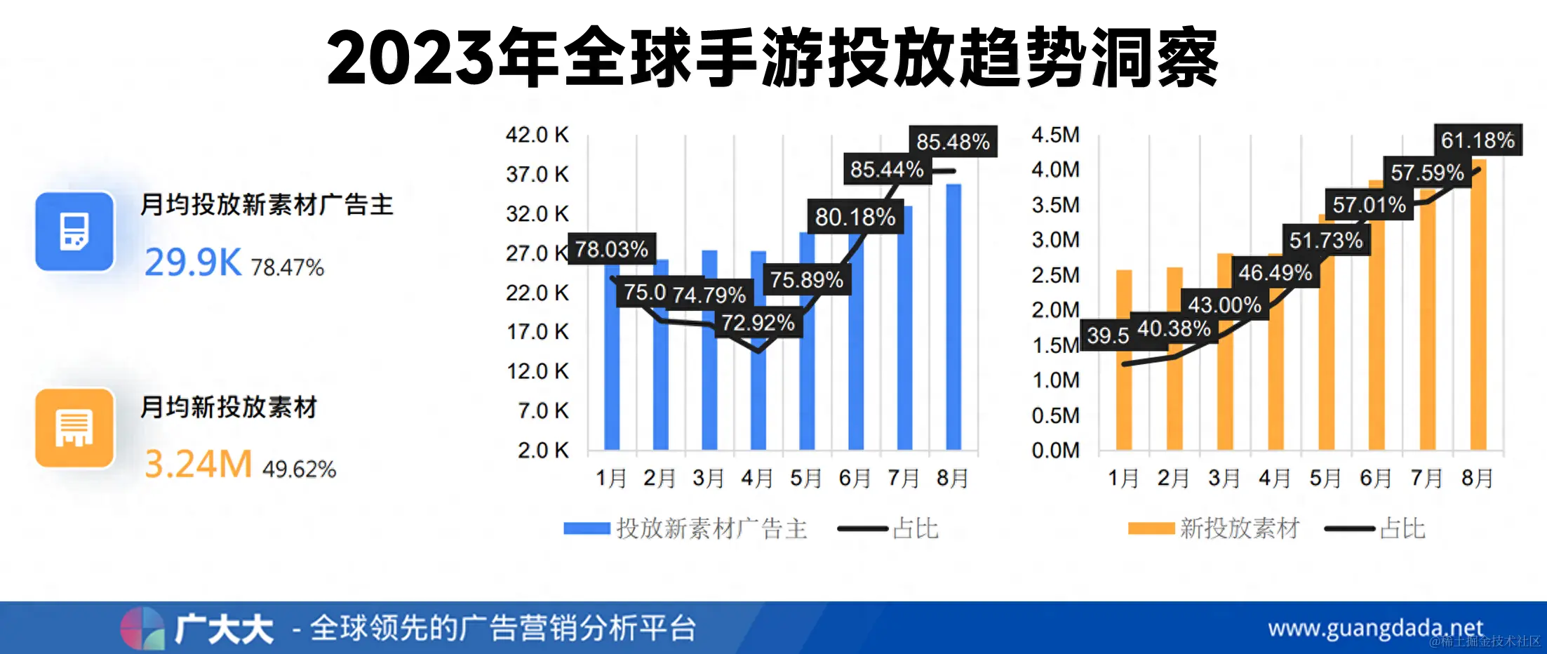 通过广大大后台抓取数据,2023年每月投放新素材广告主数量和每月新投放素材都呈现明显的上升趋势,广告主需要用更新且更有意思的创意去吸引用户。