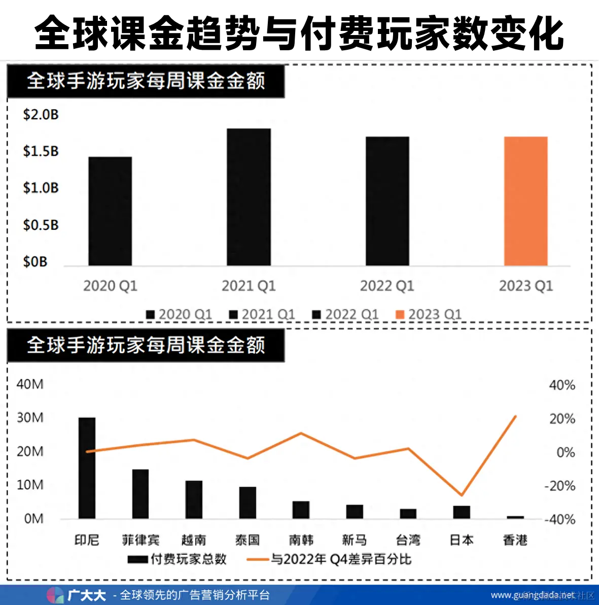 在2023最新数据中,全球手游游戏玩家每周花费约16.3亿美元,且支出水平相较3年前增长了29%。尽管消费者支出尚未达到疫情高峰水平,但游戏市场正进⼀步扩大。 从付费人数趋势上来看,表现最好的是印尼,人口基数大且互联网基建快速发展,占据份额共达3000万,并与上⼀季持平。 而中国香港、韩国、越南则是消费支出的最大推动者,均有不错的成长趋势,中国香港虽人口较少但总体增幅最大。泰国和新马相较2022年Q4下降了4%,而日本玩家的付费兴趣则有显著的减少,相较2022年Q4下降了26%,但并不⼀定意味着消费支出的绝对增长 。