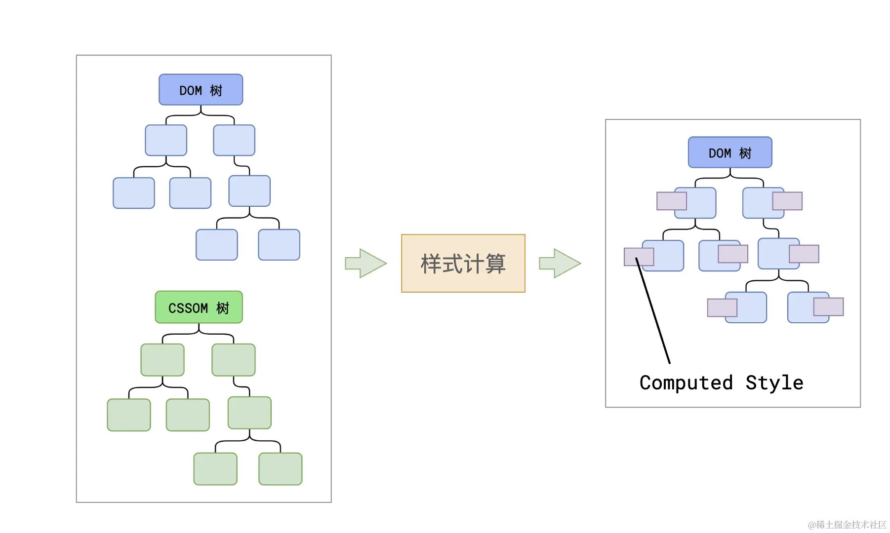 主线程会遍历得到的 DOM 树和CSSOM,依次为树中的每个节点计算出它最终的样式,称之为 Computed Style。