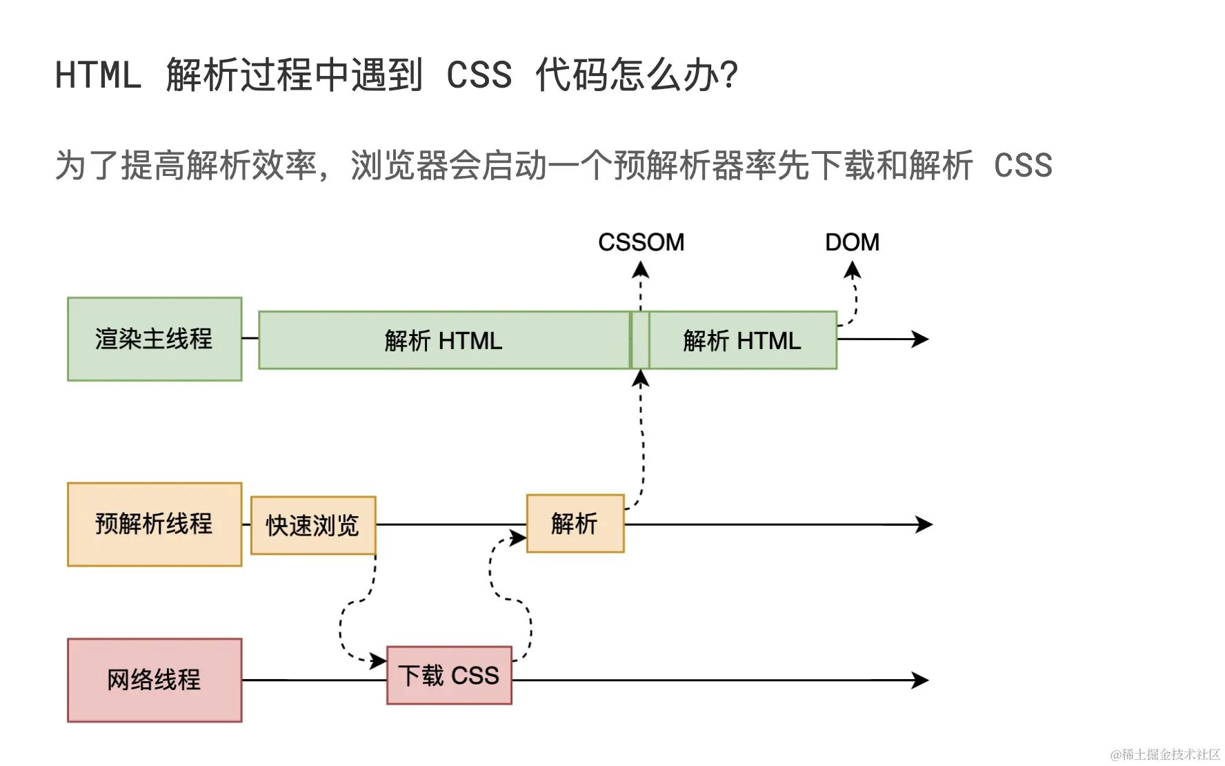 这是因为下载和解析 CSS 的工作是在预解析线程中进行的。这就是 CSS 不会阻塞 HTML 解析的根本原因。