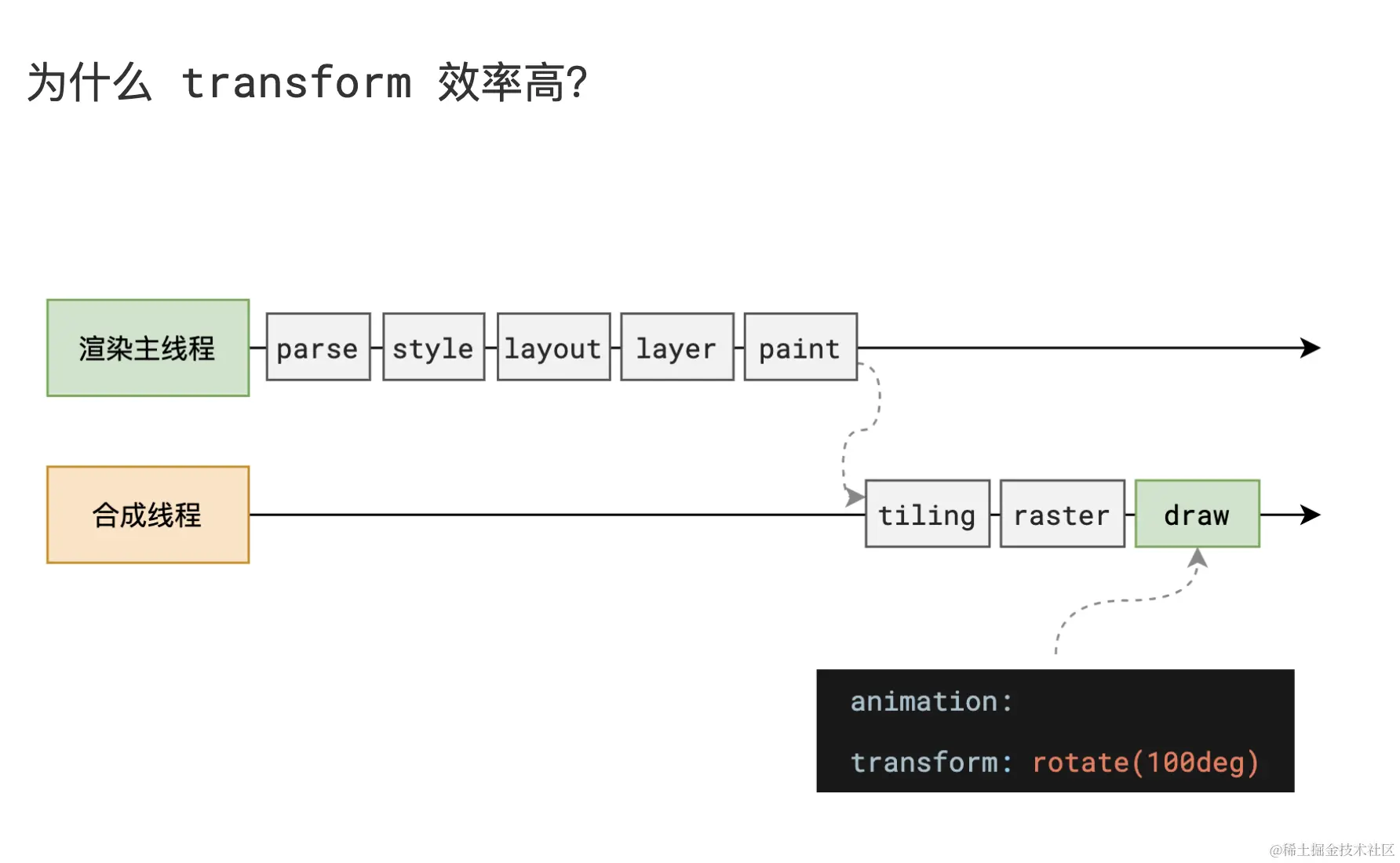 因为 transform 既不会影响布局也不会影响绘制指令,它影响的只是渲染流程的最后一个「draw」阶段
