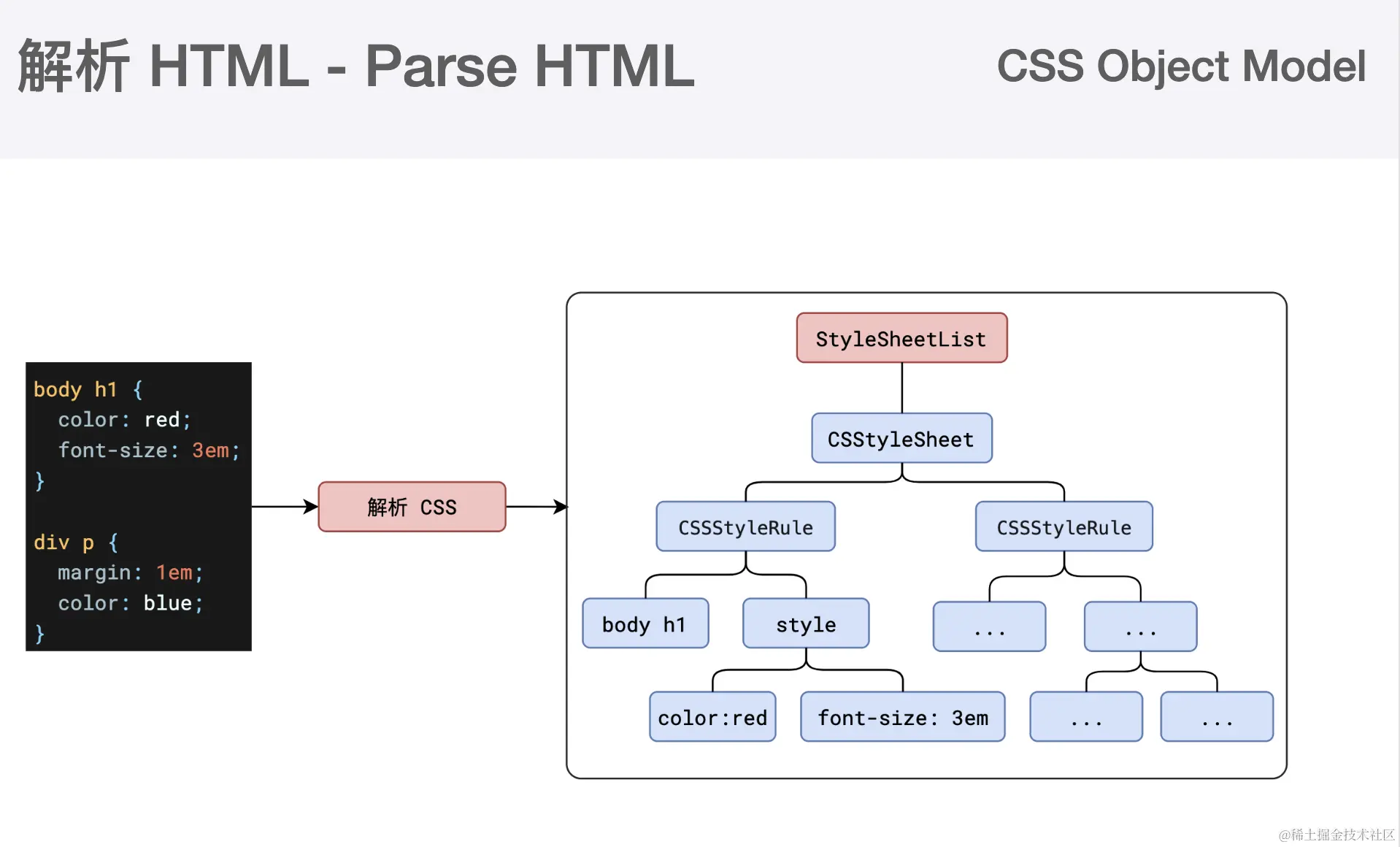 第一步完成后,会得到 DOM 树和 CSSOM 树,浏览器的默认样式、内部样式、外部样式、行内样式均会包含在 CSSOM 树中。