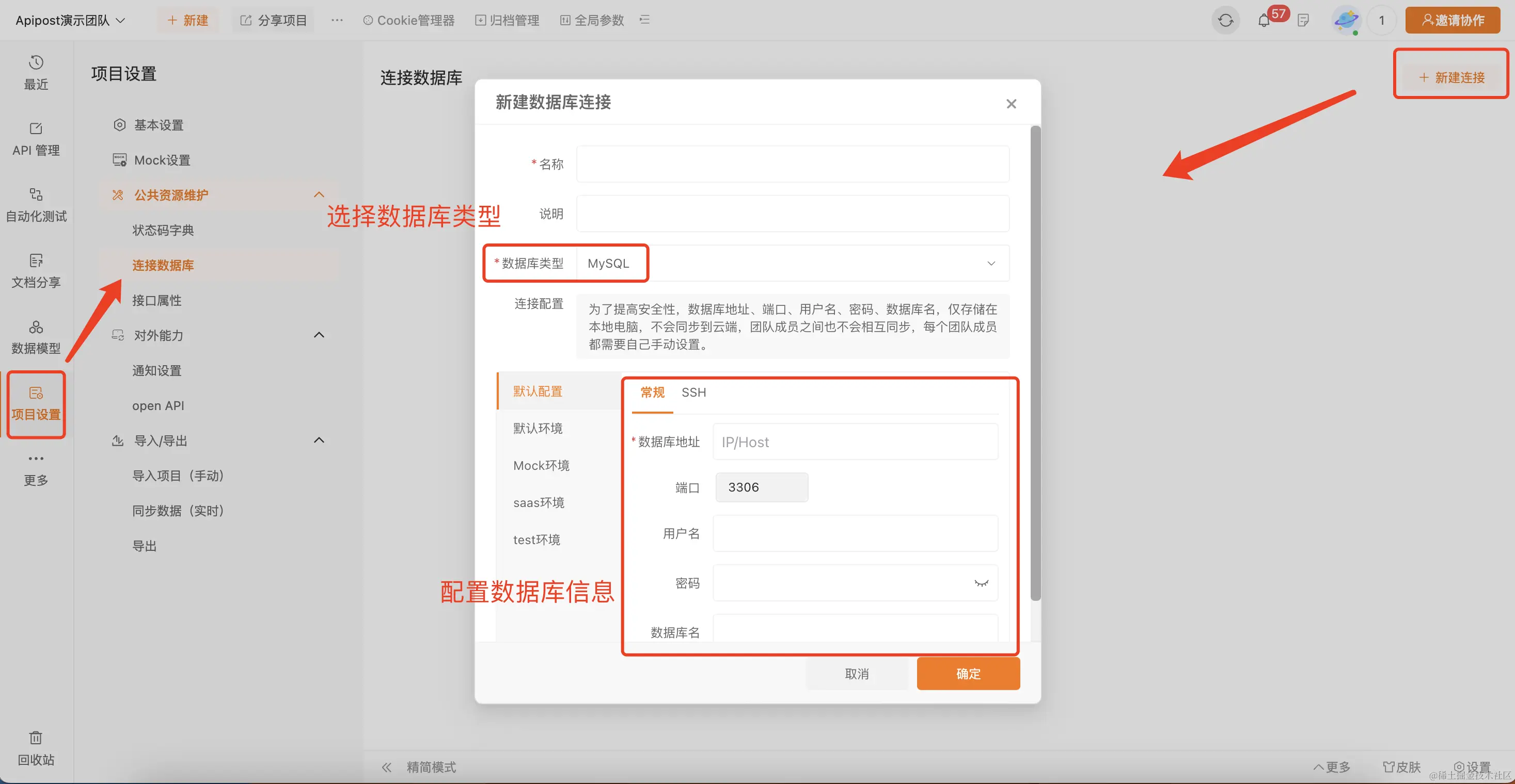 Apipost提供了数据库连接功能,以便开发者可以在接口调试中可以使用数据库获取入参或进行断言校验 目前7.2.2的Apipost支持Mysql、SQL Sever、Oracle、Clickhouse、达梦数据库、PostgreSQL、Redis、MongoDB8种数据库的连接操作 目前Apipost支持在Api调试、接口用例、自动化测试的预执行、后执行脚本中进行数据库的相关操作