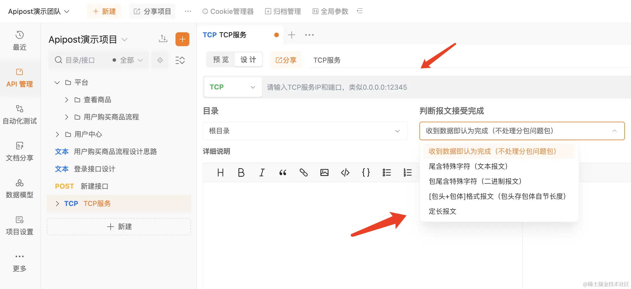 Apipost新增TCP协议接口调试,调试前需要创建TCP服务,并配置服务IP和端口,报文接收判断。