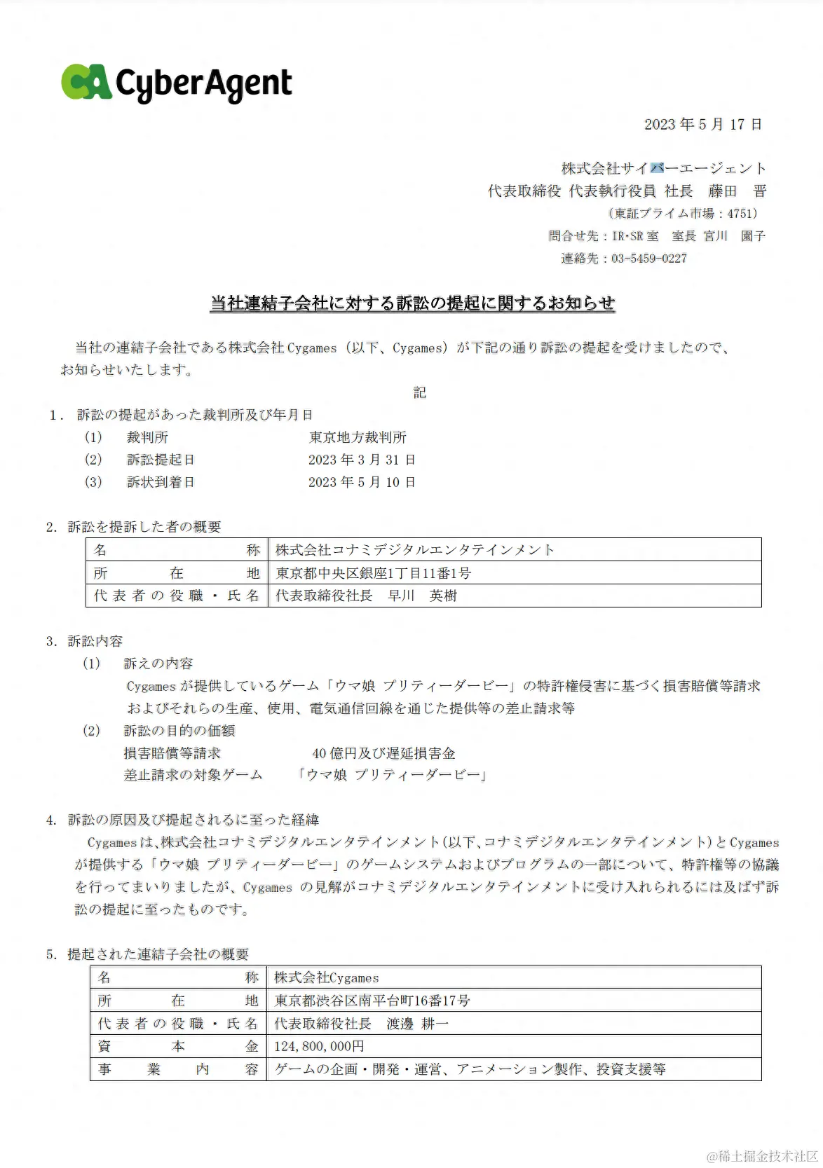 2023年3月31日,KONAMI科乐美在东京地方裁判提起诉讼,称二次元手游【ウマ娘プリティーダービー】侵权其旗下棒球手游【実況パワフルプロ野球】相关专利,将索赔40亿日元的天价补偿,并且要求【赛马娘】手游停止营运。