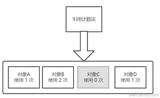 这种情况下,每创建一个对象就会被分配一个计数器,没使用一次这个对象计数器就会 +1,引用计数法就是根据这些使用的次数,假设有下面 4 个对象,对象C 的使用次数为 0 ,所以在进行 GC 回收的时候就会把 对象C 回收清除掉。