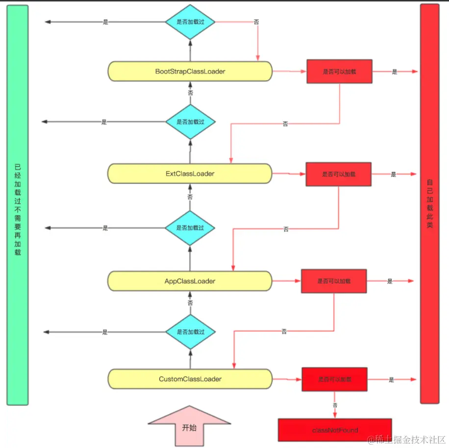 3. 启动类加载器检查是否能够加载当前这个类,能加载就结束,使用当前的加载器,否则,抛出异常,通知子加载器进行加载