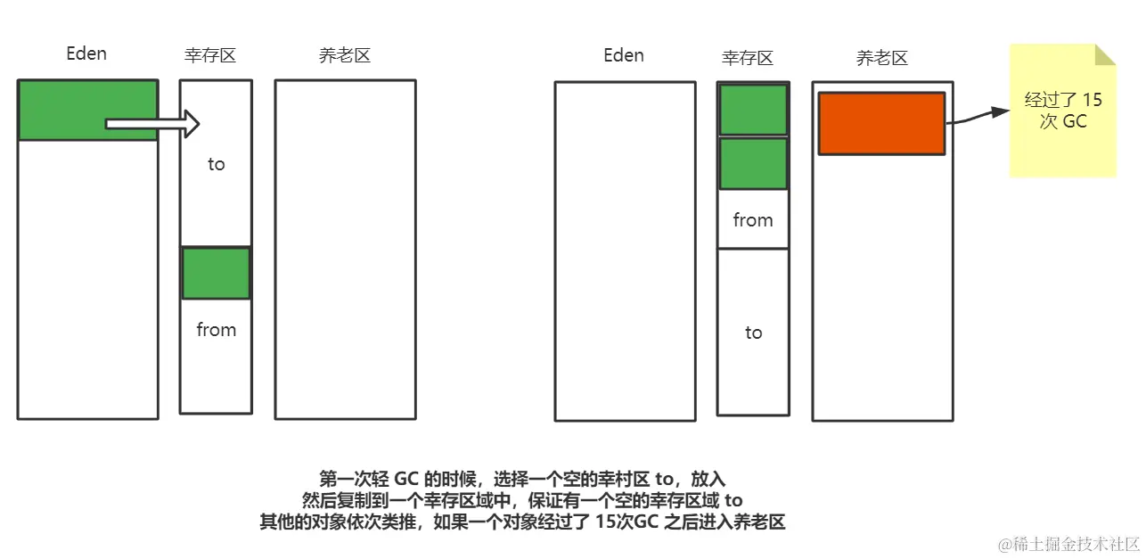 - 假设一个对象经过 Eden GC 之后活下来了,然后会选择移到幸存区中,从 from 和 to 中选择一个足够存活的区域