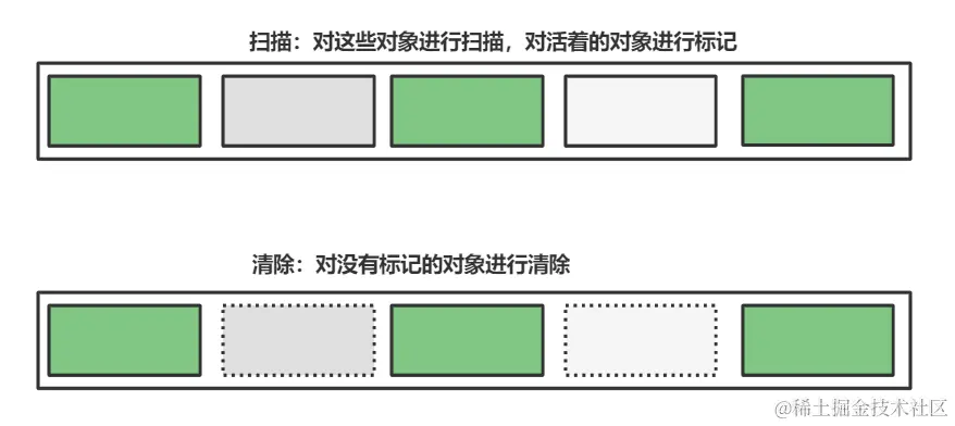 - 缺点:两次扫描严重浪费时间;会产生内存碎片;