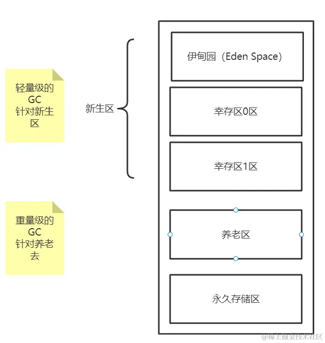 - 轻 GC(普通的 GC),只是针对新生代、偶尔关注一下幸存区