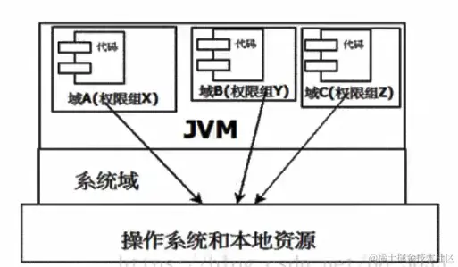 当前最新的安全机制实现,则引入了域(Domain)的概念,虚拟机会把所有代码加载到不同的系统域和应用域,系统域部分专门负责关键资源进行交互,而各个应用域部分则通过系统域的部分代理来对各种需要的资源进行访问。虚拟机中不同的受保护域(Protected Domain),对应不一样的权限(Permission)。存在不同域中的类文件就具有了当前域的全部权限,下图是 jdk1.6 最新的安全模型