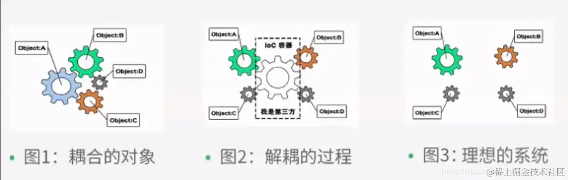 控制反转 IOC 是一种设计思想,DI (依赖注入) 是实现 IOC 的一种方法,没有 IOC 的程序中,使用面向对象编程,对象的创建与对象间的依赖关系完全硬编码在程序中,对象的创建由程序自己控制,控制反转后将对象的创建转移给第三方,所谓控制反转就是:获得依赖对象的方式反转了。