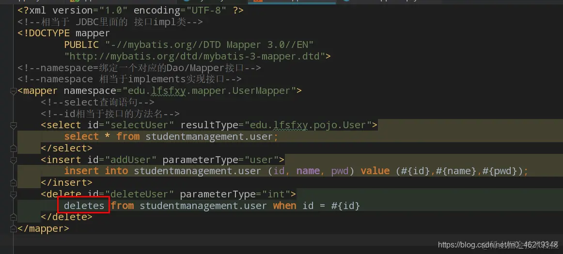 <bean id="userMapper" class="edu.lfsfxy.mapper.UserMapperImpl">