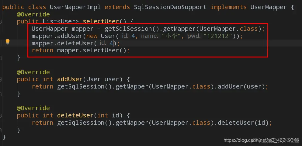 public class UserMapperImpl extends SqlSessionDaoSupport implements UserMapper { @Override public List<User> selectUser() { UserMapper mapper = getSqlSession().getMapper(UserMapper.class); mapper.addUser(new User(4,"小李","121212")); mapper.deleteUser(4); return mapper.selectUser(); } @Override public int addUser(User user) { return getSqlSession().getMapper(UserMapper.class).addUser(user); } @Override public int deleteUser(int id) { return getSqlSession().getMapper(UserMapper.class).deleteUser(id); } }
