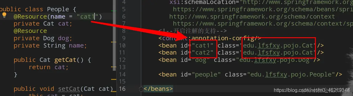 - 在 resources 下建立 beans.xml 文件,并粘贴下面代码