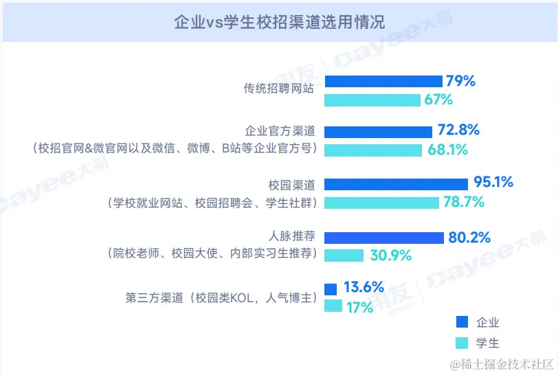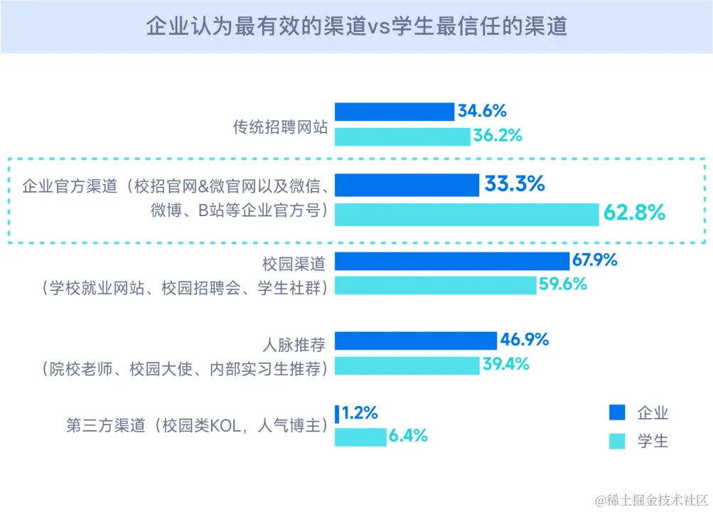 我们分析,这中间存在一定的信息差,即企业「做了」并不等于「学生知晓」,学生只能寻求官方渠道获取信息,忽略了更为便捷的人脉推荐渠道,因此企业官方渠道的建设与人脉广度的铺设都需要持续发力。