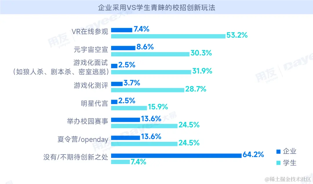 在本次调研中我们发现,学生们期待眼前一亮的校招,却鲜有企业采用了创意化的校招玩法,数据显示,64.2%的调研者表示自己所在的企业校招并无创新之处,只有15%左右的企业开始拥抱新技术,尝试元宇宙空宣、VR招聘等创新方式。