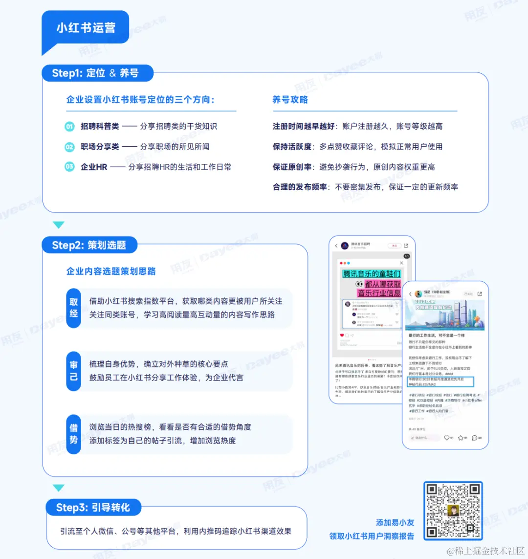 在转化环节,企业可以通过「大易内推码」追踪该渠道产生的简历量。运营者可以在发布的图文中植入内推码信息,且该内推码仅小红书渠道使用,如此一来,小红书带来的简历量便可以轻松得知。