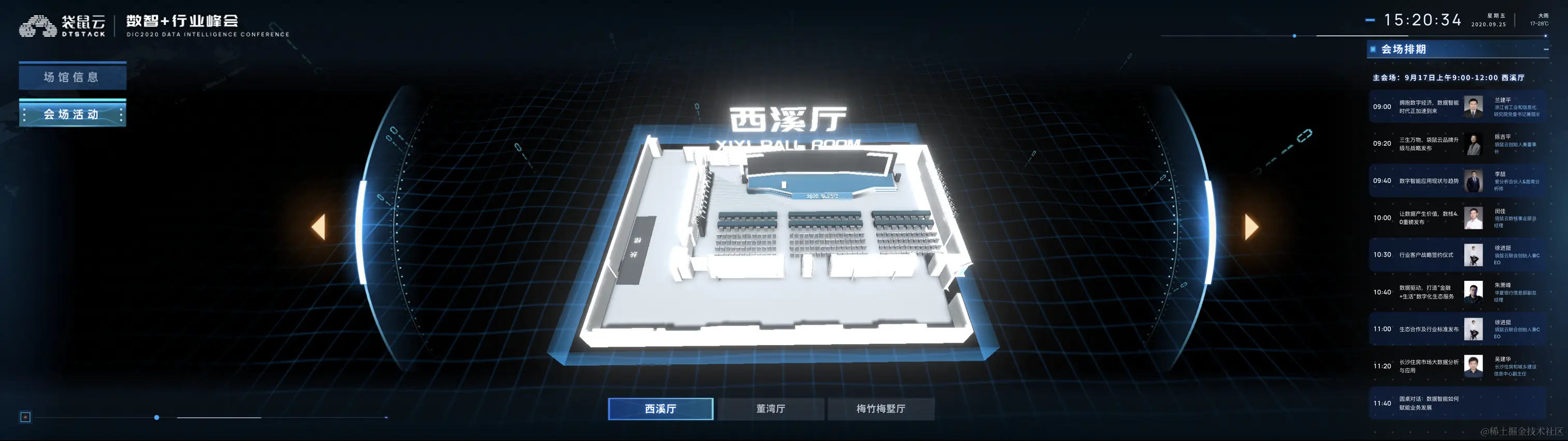 **3.会场活动-西溪厅:**会西溪厅进行一个3D展示,呈现会场的清晰布局,并在右侧显示会场排期,可有效帮助信息的获取和传递。