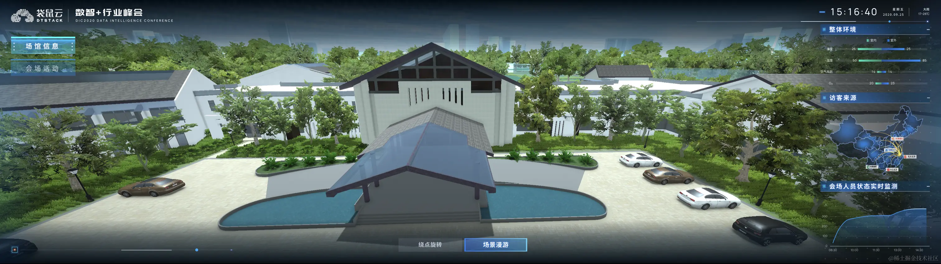 左侧共分为场馆信息、会场活动。可点击切换两个不同场景。右侧为整体环境、访客来源以及会场人员状态实时监测。