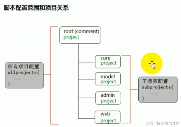 在 root 项目中 build.gradle 中使用 allprojects/subprojects 来做公共的配置,所有项目使用 java,web项目用 war