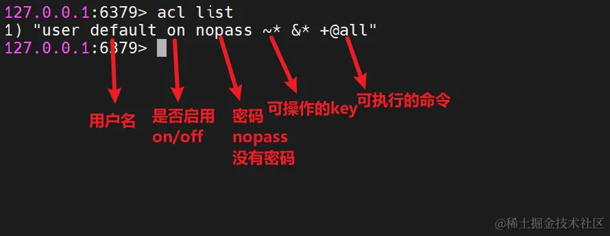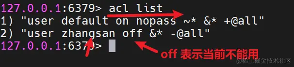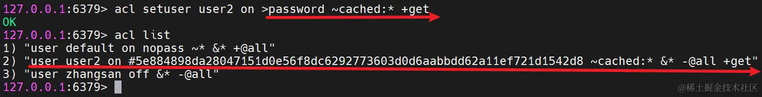 acl setuser user2 on >password ~cached:* +get+get 表示这个用户只能使用 get 命令