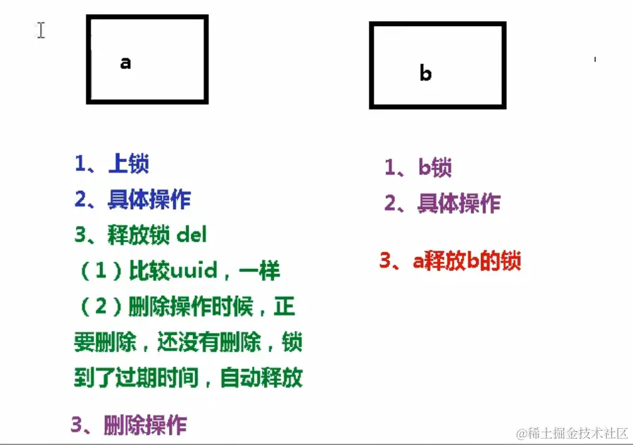 问题描述:两个操作 a,b,当 a 操作的时候 1.上锁,2. 具体操作,3. 释放锁。在释放锁的时候使用 uuid 比较,是相同的进行删除操作,正在删除还没有删除的时候,碰巧这个锁到了过期时间了,锁会自动释放,当锁释放时 b 获取到了这个锁,然后 b 进行具体操作,这是 a 还没有结束,仍然进行删除操作,a 就释放掉了 b 的锁。这个问题就是因为目前操作中没有原子性造成的,在操作过程中会互相干扰。