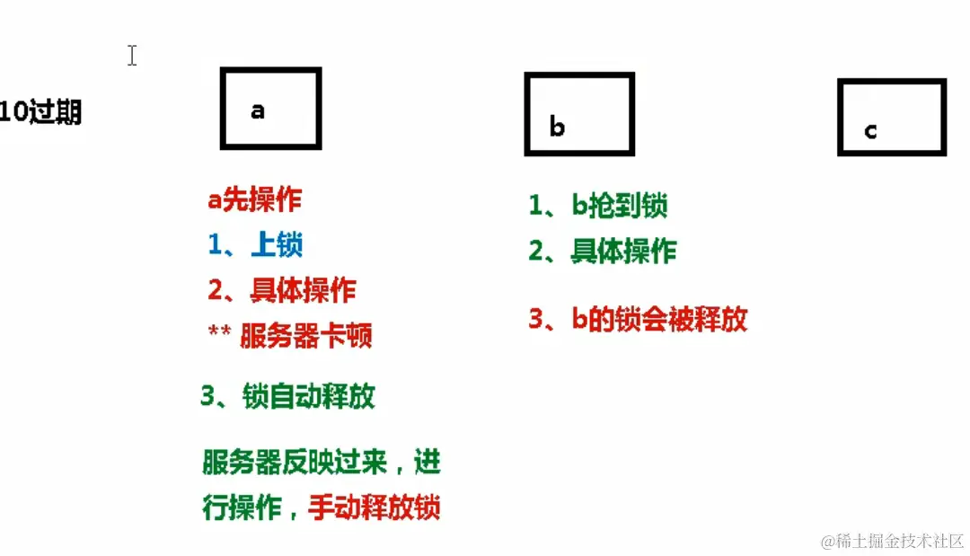 锁误删的场景:假设设置锁的过期时间为 10 秒,有3 个访问,a、b、c。然后a 请求首先抢到锁,然后1. 上锁,2. 具体操作,操作的时候服务器突然卡顿,然后 b 就抢到锁,b 进行具体操作,然后b 正在操作的时候 a 反应过来了继续进行操作,但此时如果 a 执行完毕,b 也执行完毕,那这个锁应该由谁进行释放?锁是 a 抢到的,a 要释放,b 也抢到了锁并且也进行了具体操作,b 也要释放,所以会产生 二义性。
