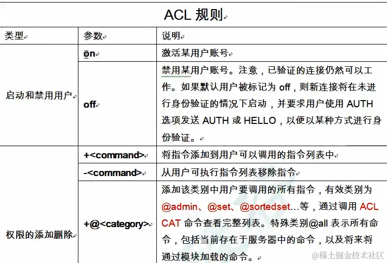 下面是有效 ACL 规则的列表。某些规则只是用于激活或删除标志,或对用户 ACL 执行给定更改的单个单词。其他规则是字符前缀,它们与命令或类别名称、键模式等连接在一起。