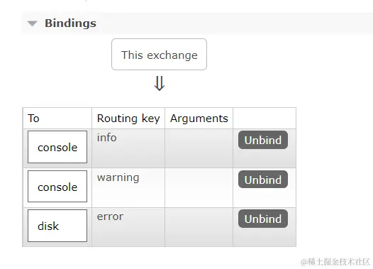- Binding:exchange 和 queue 之间的虚拟连接,binding 中可以包含 routing key,Binding 信息被保存到 exchange 中的查询表中,用于 message 的分发依据。